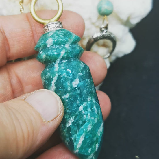 Pendule taillé main en Amazonite verte zèbrée blanche de Russie. Très typique de ce pays.
