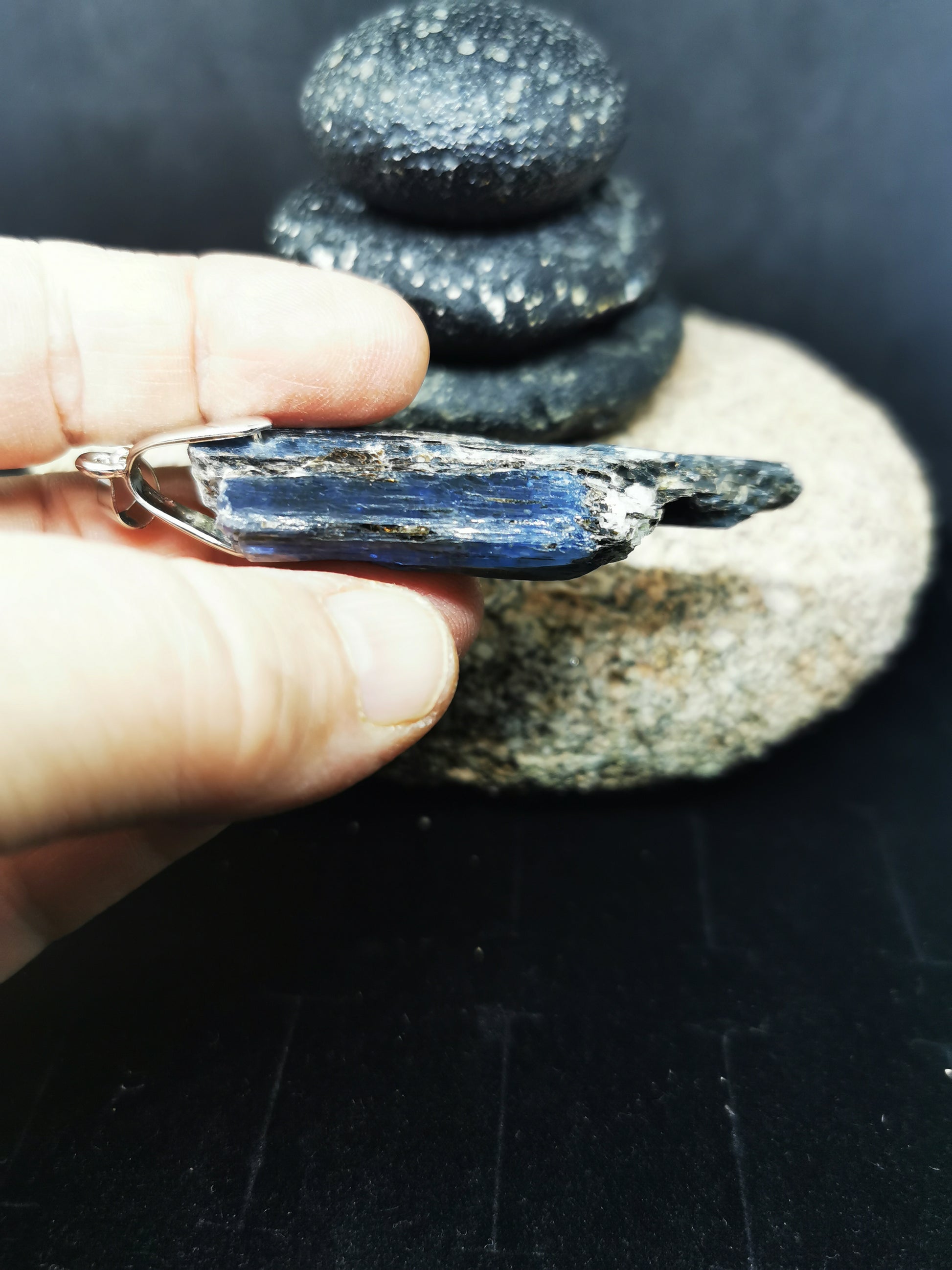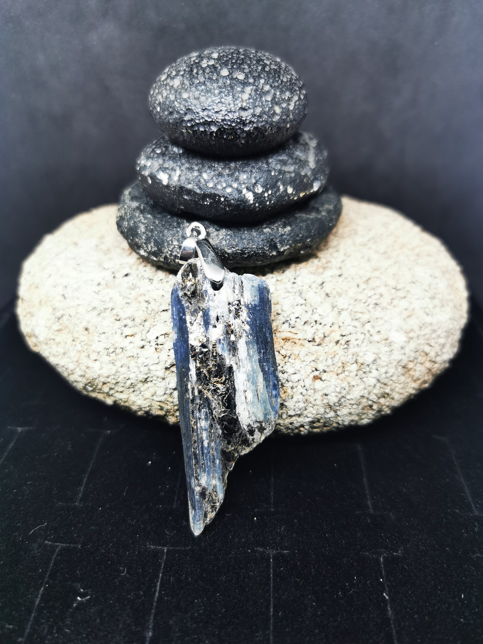 Pendentif avec bélière inoxydable en Cyanite bleue irisée argentée du Brésil. Ce pendentif est une pierre brute où les inclusions de mica paillettes sont magnifiques.