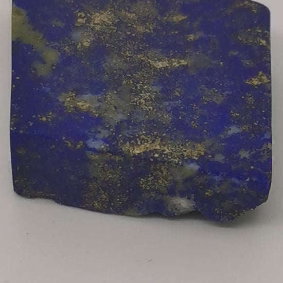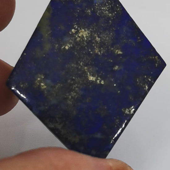 Pendentif taillé en lapis lazuli. Arrière de la pointe du cabochon brut. Volonté d'un losange asymétrique, plus brut et simplifié pour mettre en évidence l'essence même de la beauté de ce minéral.