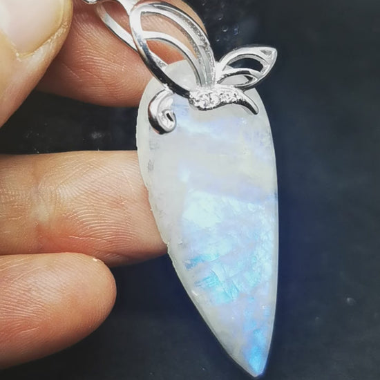 Pendentif pierre de lune (bellomorite) montée sur bélière papillon argent. S'accorde parfaitement avec les boucles d'oreille du site.